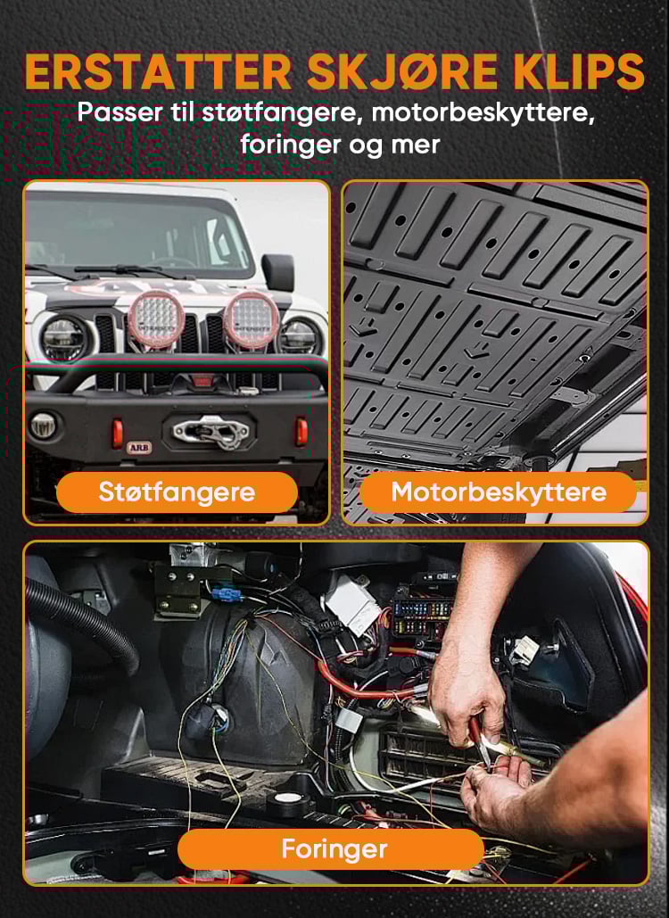Det pleide å være så orkete å bytte ut understellsklipsene, men disse endrer alt. Bare trykk, så låser de seg – uten behov for verktøy. Jeg har byttet ut de fleste løse delene på bilen min med disse, og de holder seg veldig bra.