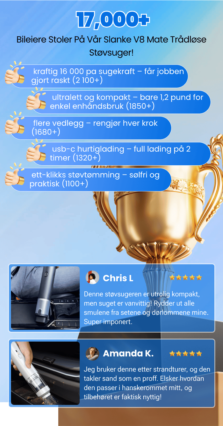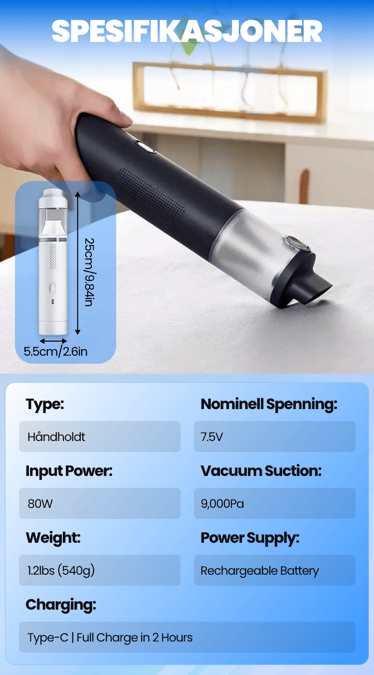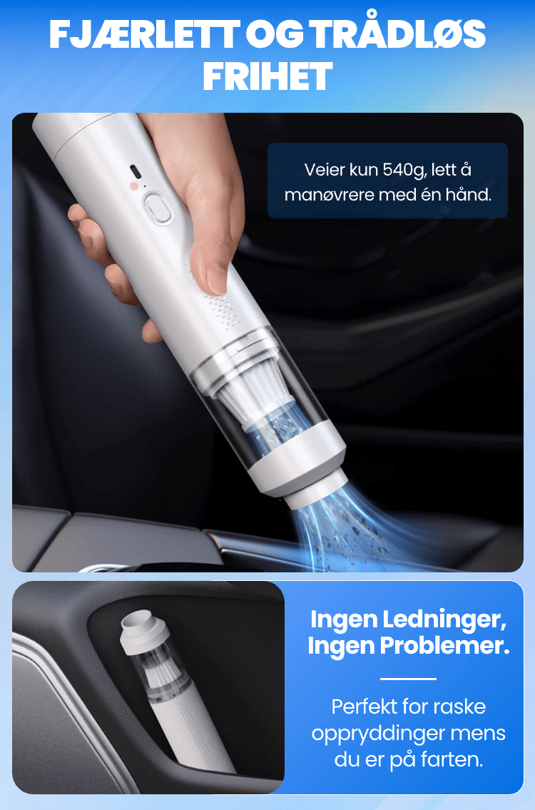 Jeg elsker den kompakte størrelsen og kraftkombinasjonen. Enkel å oppbevare, lett å rengjøre og sterk nok til å suge ut rusk fra mellom setene!
