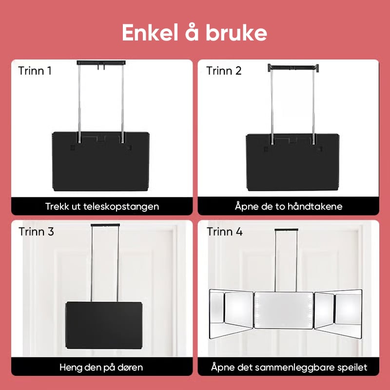 💡 Full sikt, perfekte resultater: Med tre justerbare paneler kan du se alle deler av hodet tydelig – foran, på sidene og bak – noe som gjør selvpleie enkelt og presist.