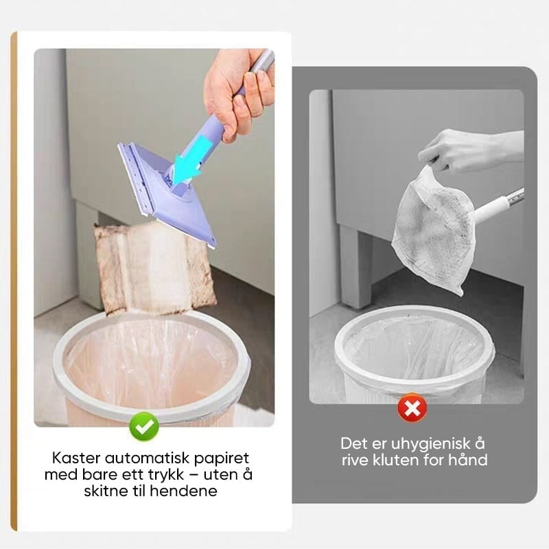 🧹Håndfri drift: Skyv-trekk-håndtaket eliminerer behovet for direkte håndkontakt når du bytter moppkluter. Bare trykk håndtaket ned for å åpne bunnen og automatisk gripe eller slippe kluten, slik at du unngår skitne hender under prosessen.